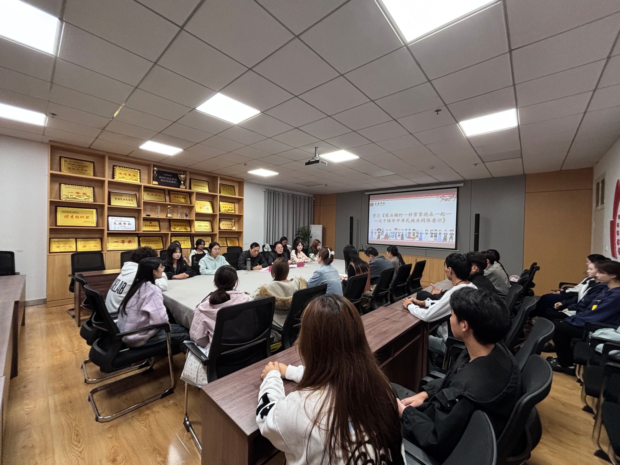 会上集中学习了《习近平文化思想学习纲要》第七章《像石榴籽一样紧紧抱在一起——关于铸牢中华民族共同体意识》重要内容。通过学习,进一步深化了师生对民族团结进步事业的认识,增强了维护民族团结的思想自觉和行动自觉。
